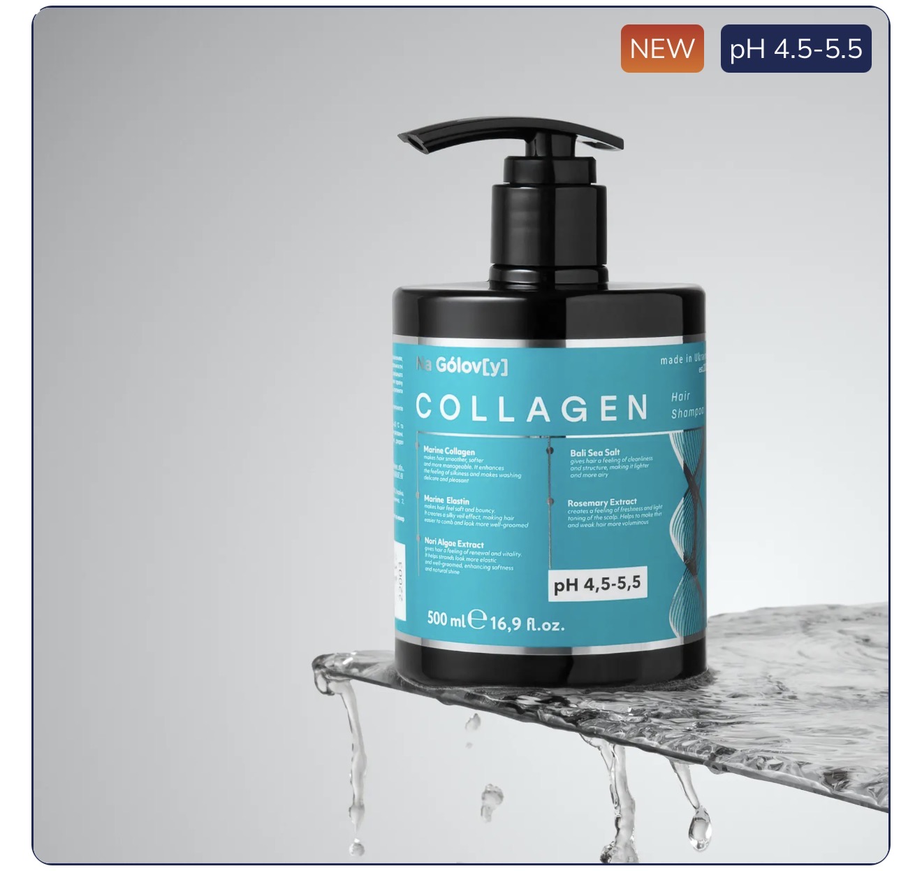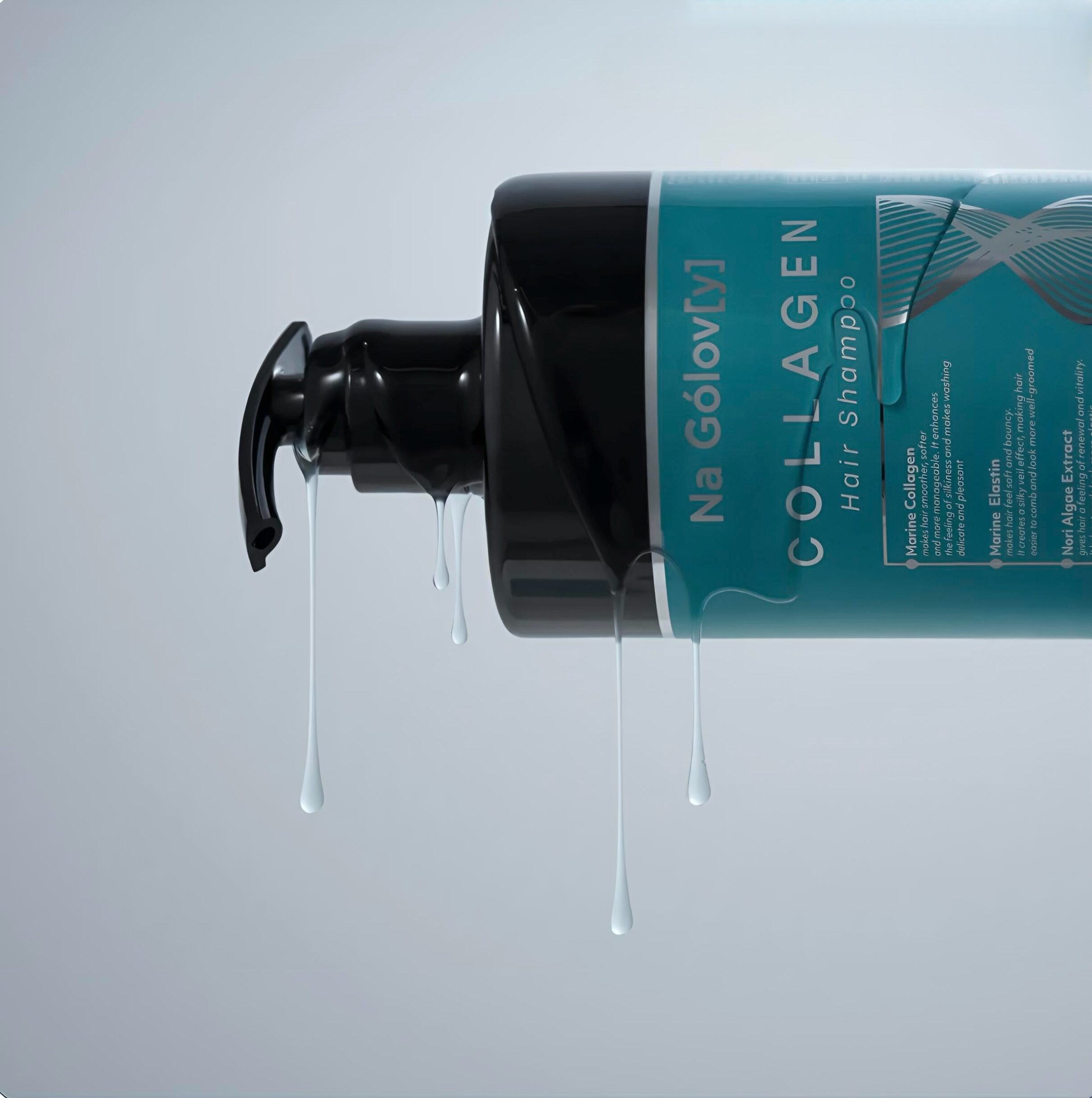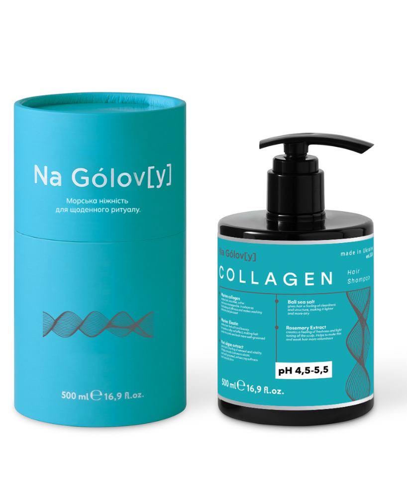 Колагеновий шампунь Na Gólov[y] — це делікатне очищення шкіри голови та волосся з ефектом ущільнення і природного обʼєму. Формула з морським колагеном та еластином допомагає підтримувати еластичність волосся, зменшує ламкість і надає пасмам гладкість та структурність.